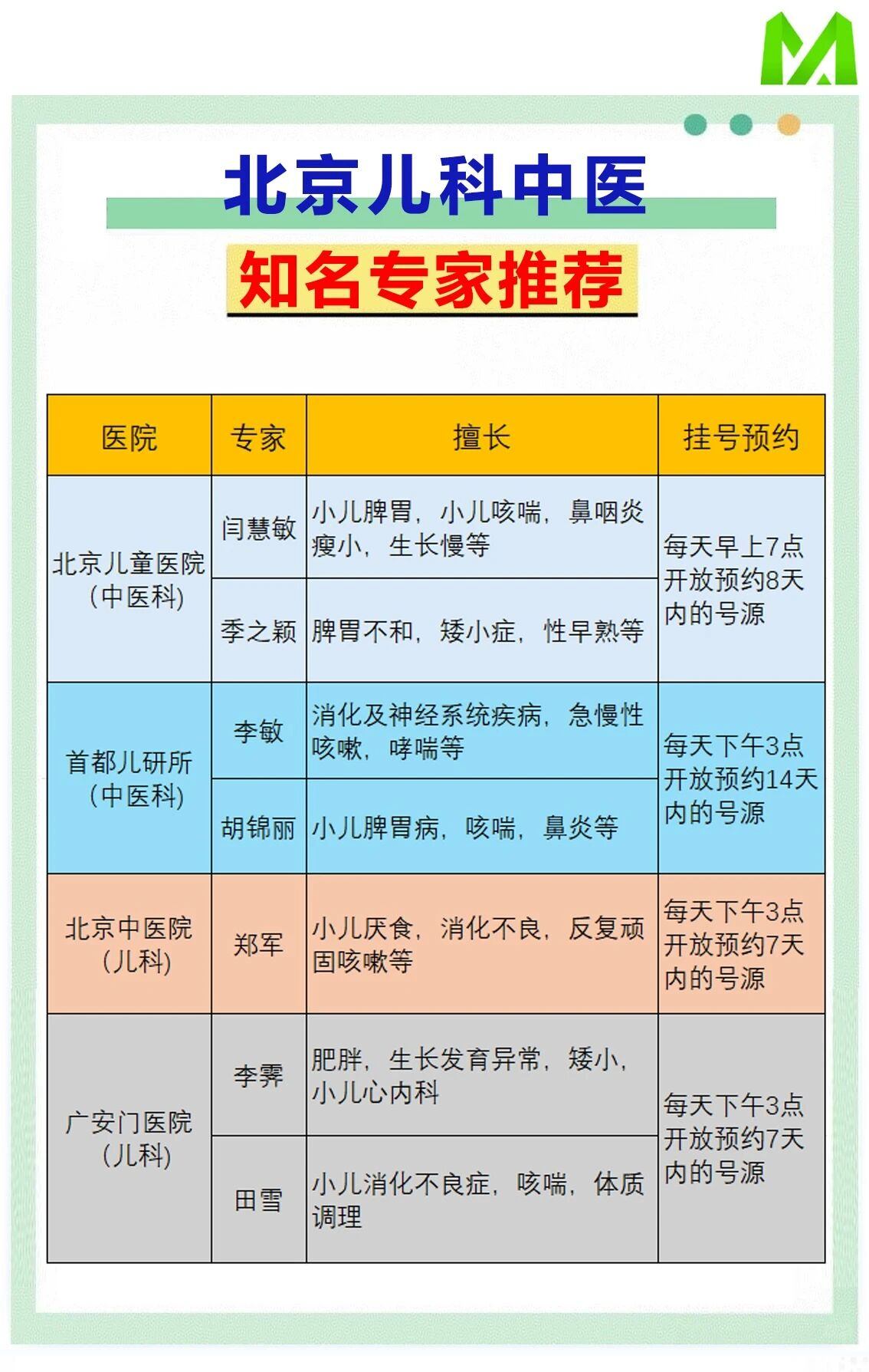 之前搜集了一些北京的知名儿科中医专家信息,今天又将这些信息做成表格,现分享给宝妈宝爸们,希望能有帮助。
